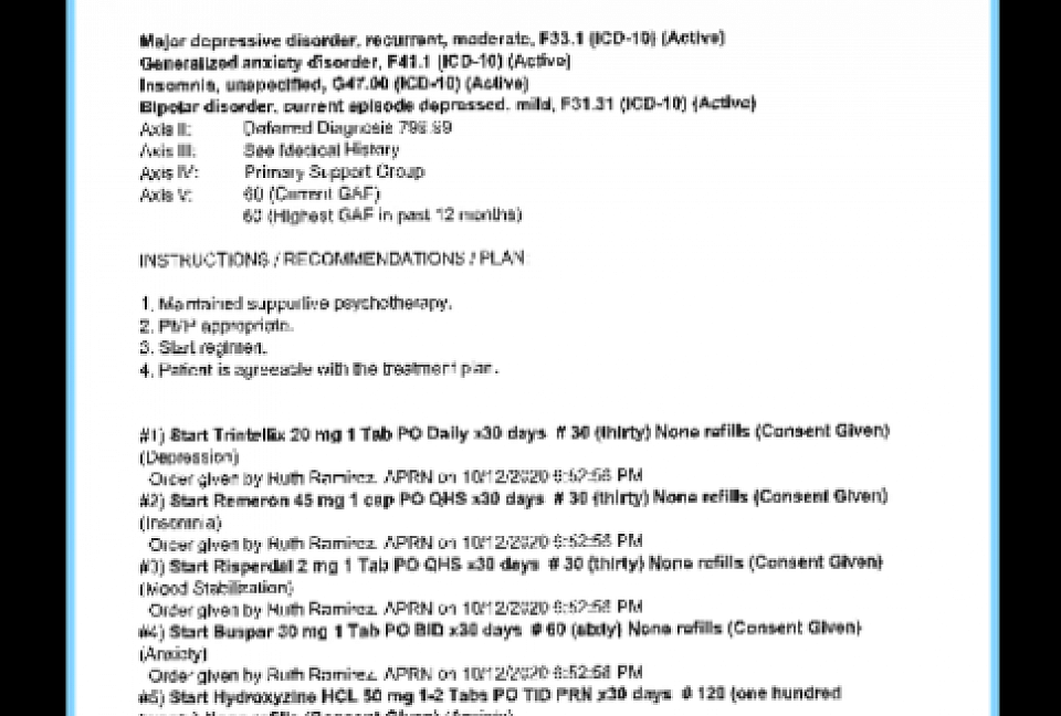 Major Depression Disorder, Bipolar Disorder, Generalized Anxiety, Panic Attacks and Insomniac.